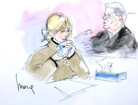 Os desenhista Mona Shafer Edwards and Bill Robles, capturaram o procedimento jurídico; entre lágrimas, cílios postiços e flashes um detalhe se tornou folclórico, sobre Paris ter retocado sua maquiagem no meio da audiência.