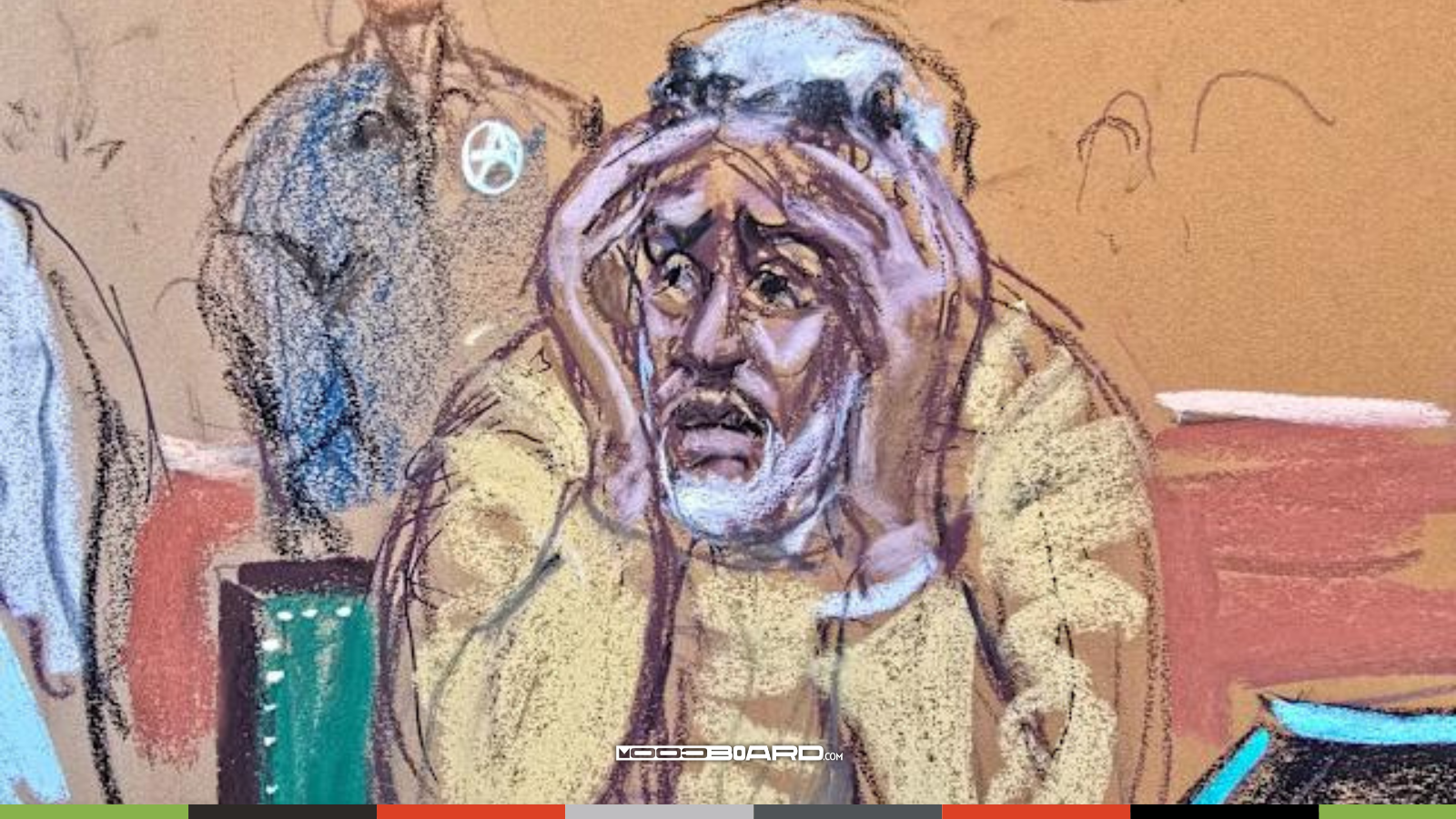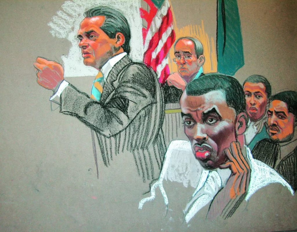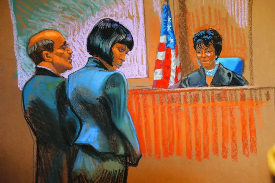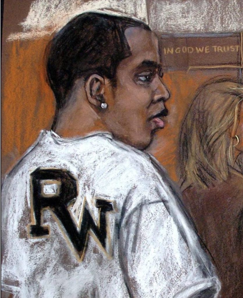 O esboço do julgamento publicado anos depois em 2015, mostra um Diddy com visual impecável, mostrando controle total sem quebrar seu personagem público.