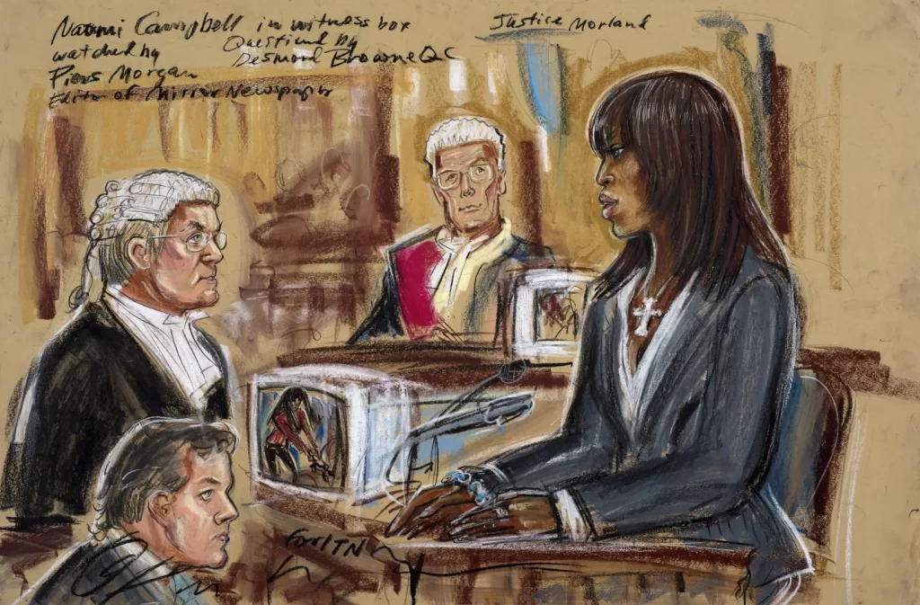 O esboço do tribunal foi ilustrado por quatro desenhistas (Priscilla Coleman, Siân Frances, Julia Quenzler e Elizabeth Cook) mostra Campbell depondo, enquanto os dois juízes do caso se aproximam a menos de um metro de distância para ouvir sua voz; um retrato quase teatral de vulnerabilidade VS poder. A modelo venceu o caso em março de 2002; o jornal recorreu, e Naomi venceu novamente em maio do mesmo ano, consolidando sua vitória contra a imprensa do Reino Unido.