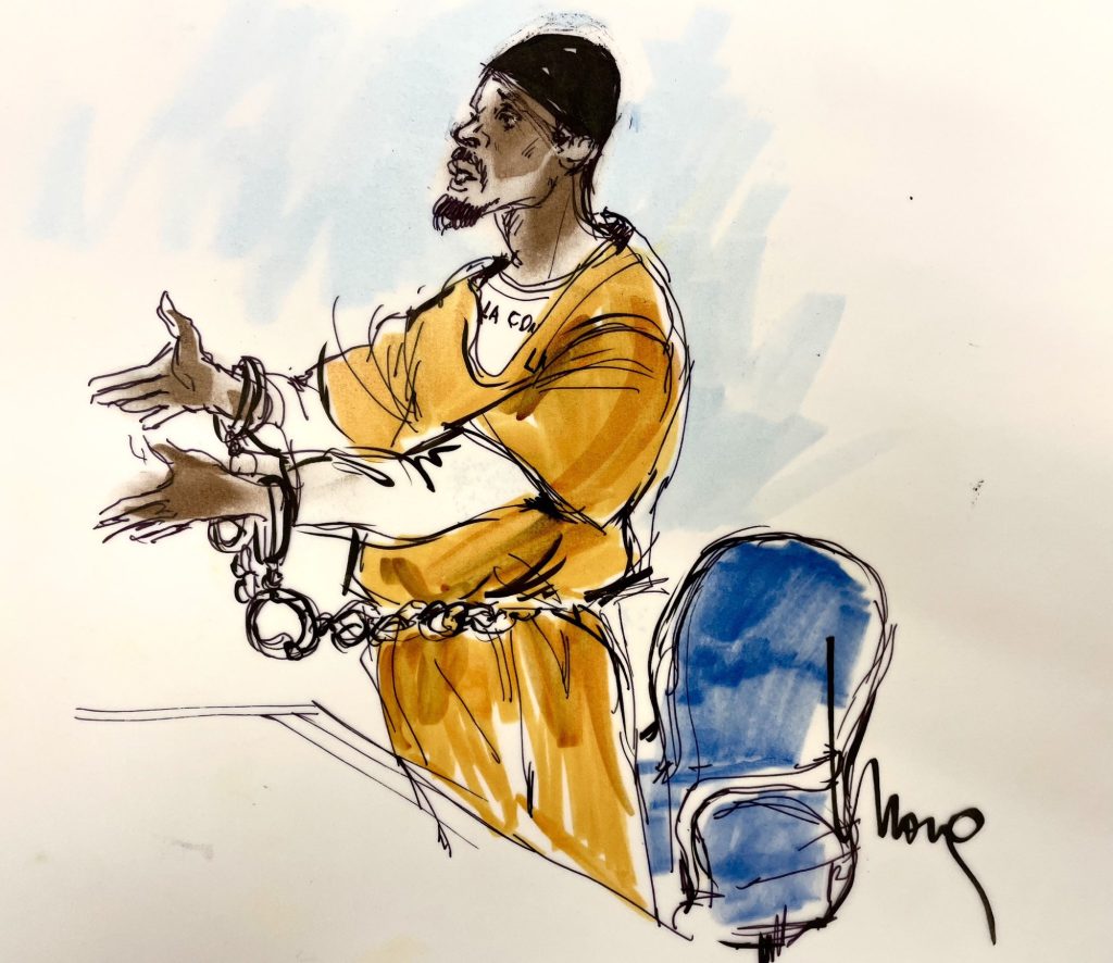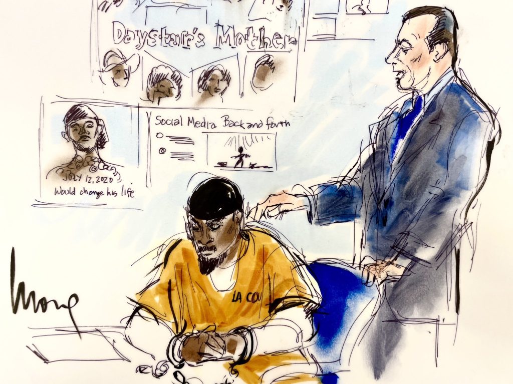Os artistas de tribunal capturaram o momento em traços duros: Lanez, vestindo com o uniforme laranja da prisão de Los Angeles, de pé diante do juiz, implorando por uma pena mais leve.