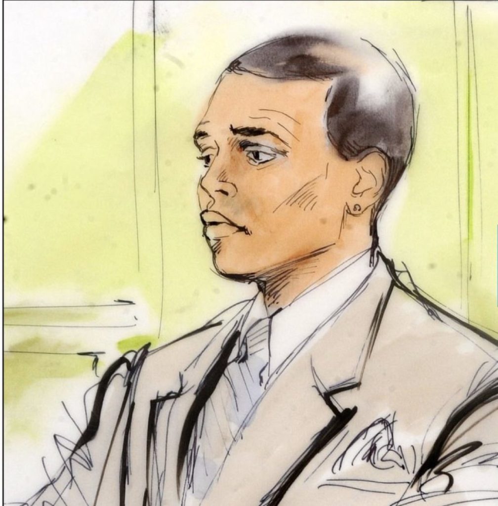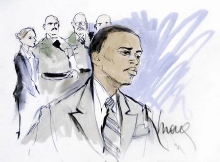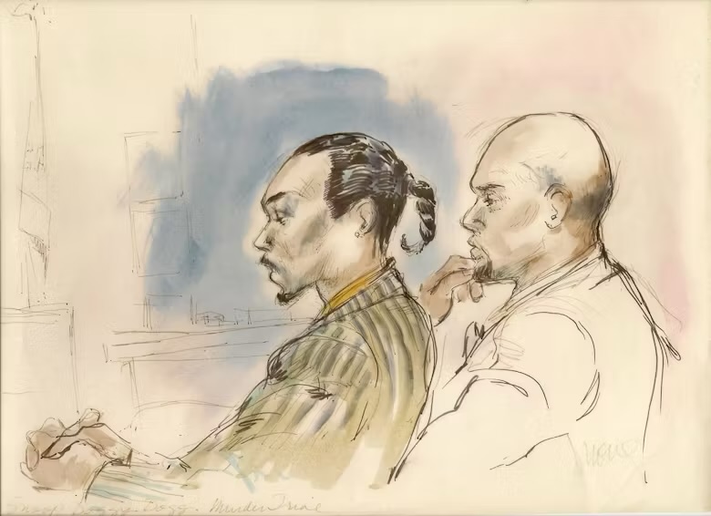 Os esboços feitos pelos desenhistas criminais Mona Edwards e Bill Robles feitos durante esse julgamento registra a arte tentando encontrar o impossível, expressões congeladas e tensões visíveis no rosto de um homem negro em julgamento global.