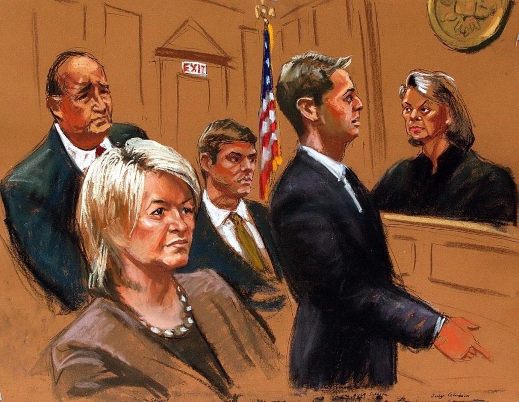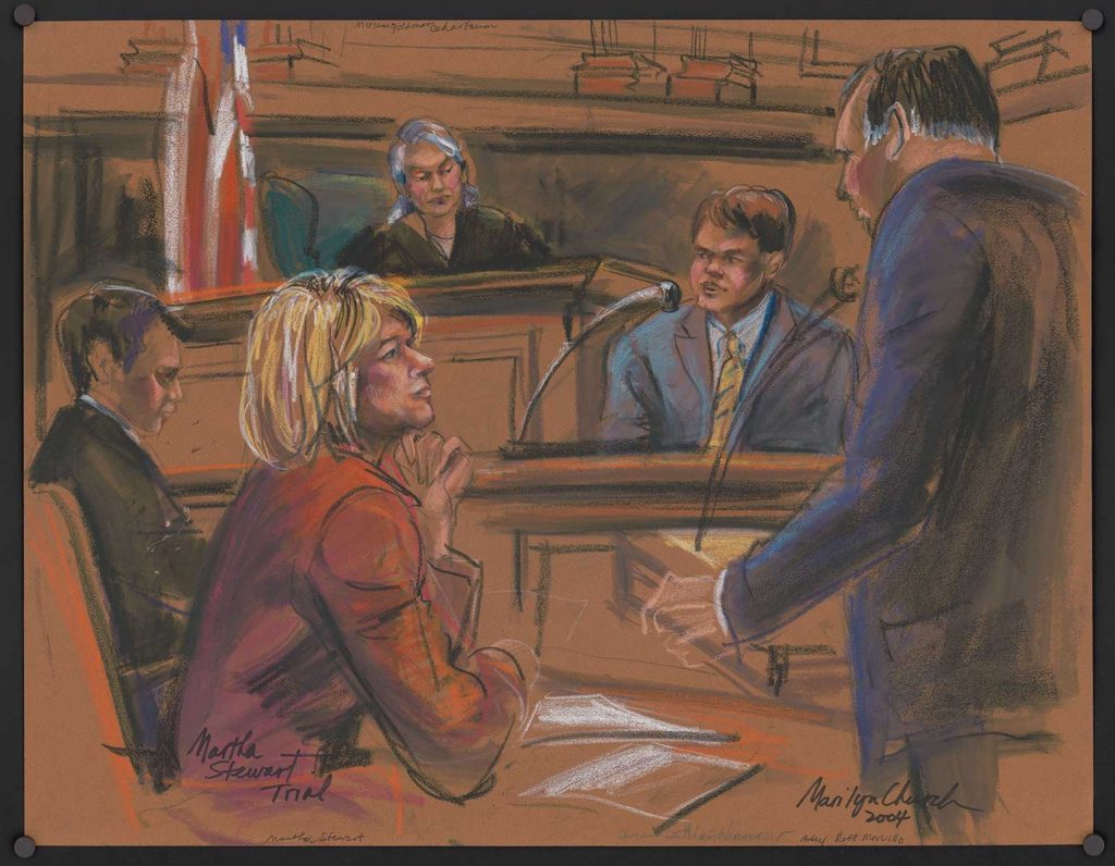 Em 2004, a magnata do lifestyle Norte Americano Martha Stewart, trocou as revistas de decoração e receitas por um assento no tribunal federal de Manhattan. Acusada de obstruir uma investigação sobre a venda de suas próprias ações, Martha acabou condenada a cinco meses de prisão. Mas o verdadeiro espetáculo, além do julgamento, foi sua imagem sendo reinterpretada pelos artistas do tribunal. Os esboços de Martha rapidamente se tornaram objeto de debate: a empresária conhecida pelo controle quase militar sobre sua marca e sua aparência não gostou nada da forma como foi esboçada. Ela chegou a confrontar a até então artista do tribunal Marilyn Church. dizendo que havia sido retratada “inchada”, e exigiu que o Wall Street Journal substituísse a ilustração por uma versão mais favorável.  Martha queria o controle do seu próprio enquadramento criminal. E conseguiu.