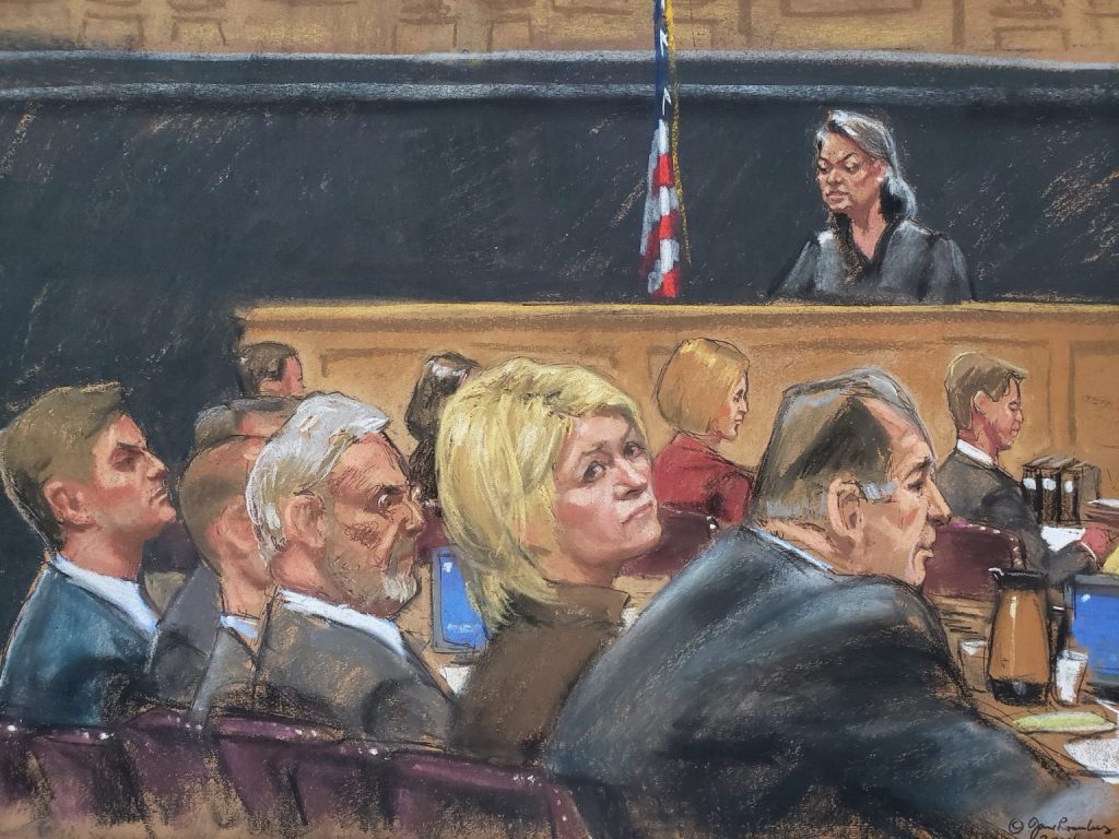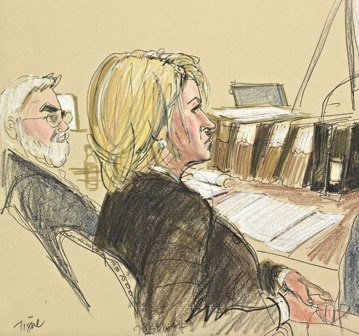 As artistas Christiane Cornell e Elizabeth Williams se certificou de obter o melhor ponto de vista disponível para desenhar Stewart junto aos seus advogados sentada na mesa de defesa.
