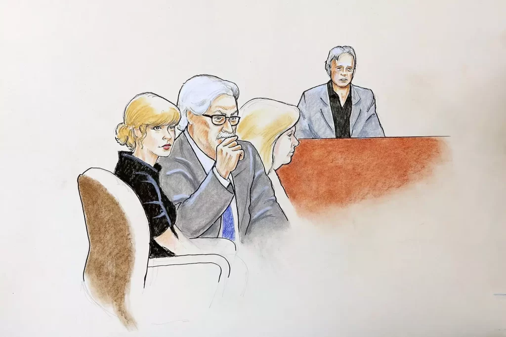 . Durante o julgamento, a cantora prestou depoimento firme, descrevendo o incidente como “horrível e chocante” e rejeitou a versão de Mueller de que teria sido apenas um empurrão ou confusão. Testemunhas corroboraram sua versão, inclusive sua fotógrafa, Stephanie Simbeck, que afirmou ter visto o radialista tocar suas nádegas, e seu segurança, Greg Dent, que disse que viu a mão dele sob sua saia. O júri decidiu a favor de Taylor Swift. Mueller foi considerado culpado de assault and battery (agressão e contato físico inapropriado), e Swift recebeu US$ 1 de indenização como gesto simbólico