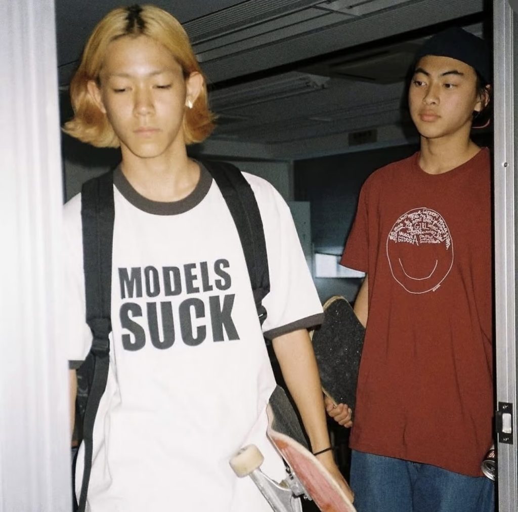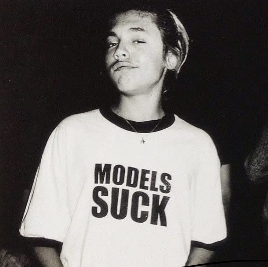 “Models Suck” apareceu pela primeira vez em uma camiseta criada pela marca de roupas Danucht eno início de 1990, e rapidamente ganhou amplo reconhecimento. A camiseta com a frase anticomercial apareceu como figurino no filme Girl 6, em 1995, dirigido pelo nosso querido cineasta Spike Lee, usada pela lendária supermodelo Naomi Campbell.